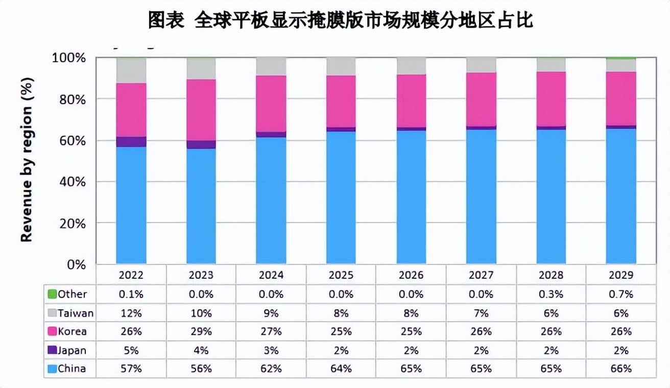 在这一全球趋势中,中国大陆市场表现尤为突出,已成为引领全球需求增长的核心引擎。我国作为全球新型显示产业第一大国,掩膜版市场规模持续扩大,国产化进程加速。自 2018 年起,中国大陆已超越韩国成为全球第一大平板显示掩膜版市场;2020 年开始,中国大陆市场规模在全球占比稳定超过 50%。根据Omdia 分析,2024 年中国大陆平板显示掩膜版销售占比已达到 62%,并预计在2026 年进一步提升至 65%,市场主导地位持续巩固,为本土掩膜版企业带来了广阔的发展空间。