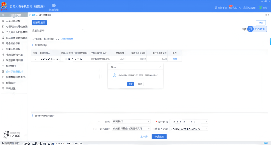 系统弹出提示框,点击【提交】。完成后系统将推送至税务机关及国库审核,审核通过后,申请的手续费将退到扣缴义务人办理退付手续费时选择的银行账户内。