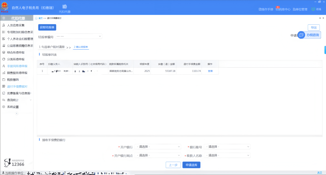 查看并确认结报单,查看申请退付手续费金额,选择“开户银行”“银行账号”等信息,点击【申请退库】。